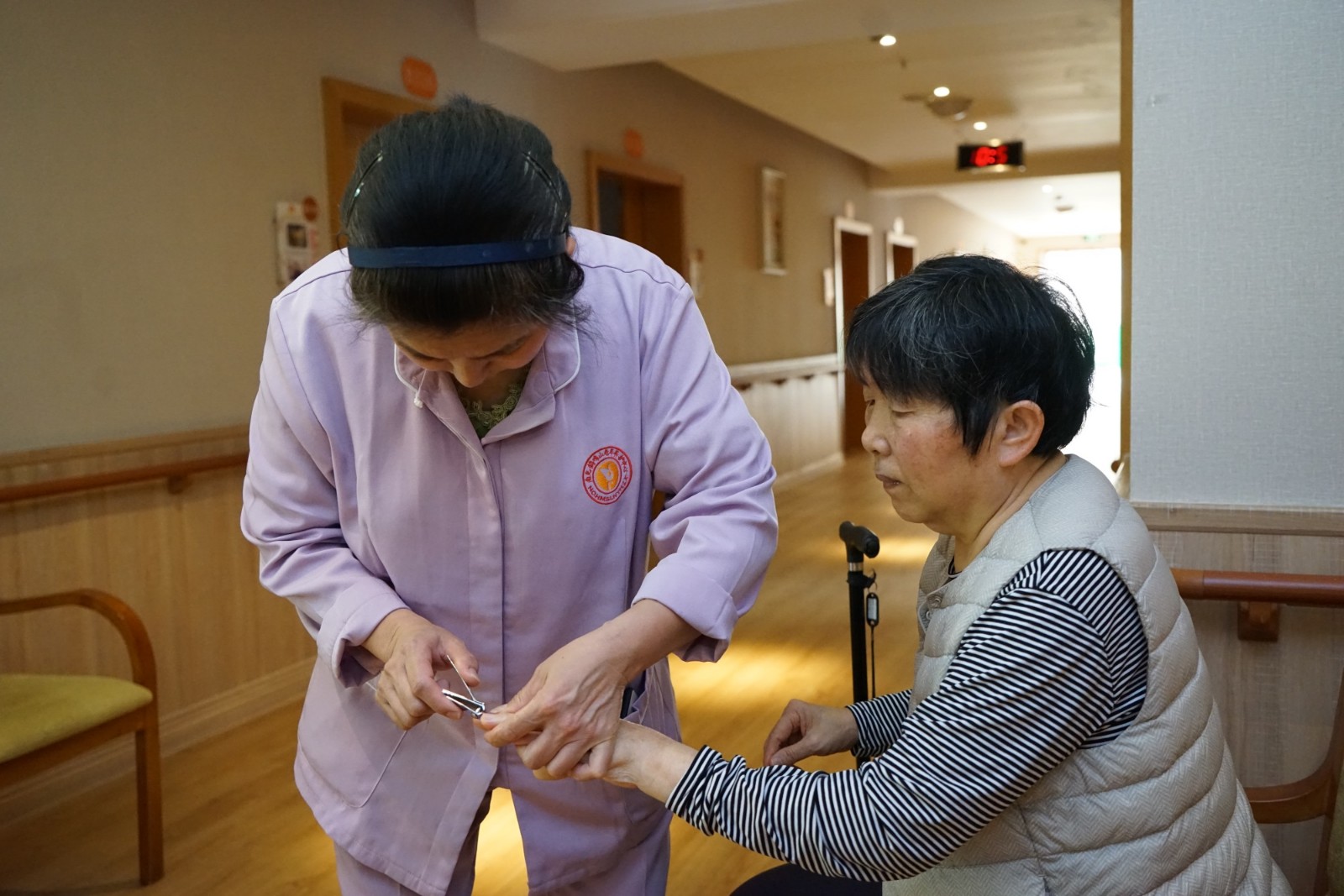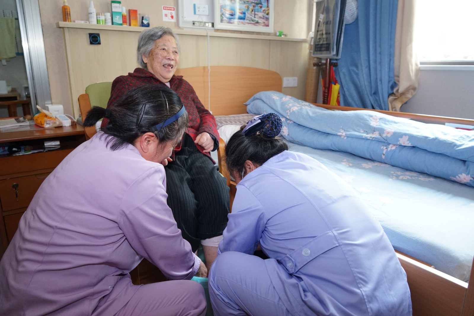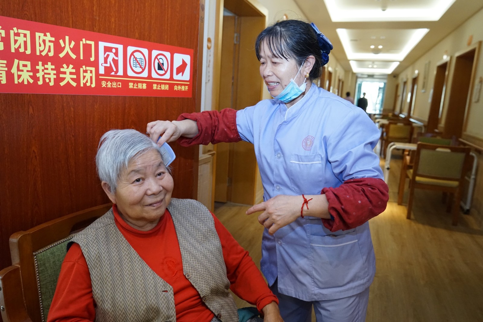 護理人員做好自身防疫的同時也為老人們送上更多的關心與溫暖,特別是走路不方便的老人,喂食、理發(fā)、剪指甲、洗腳、打掃室內(nèi)衛(wèi)生、紓解老人對疫情恐慌心理,這些原本習以為常的舉動在特殊時期總能讓人感覺倍加溫馨。