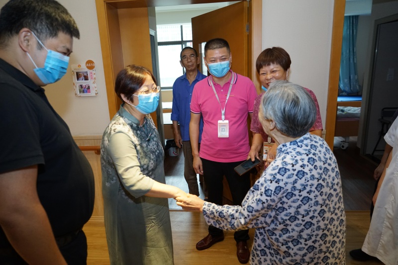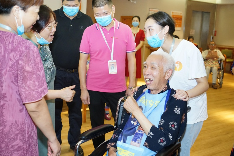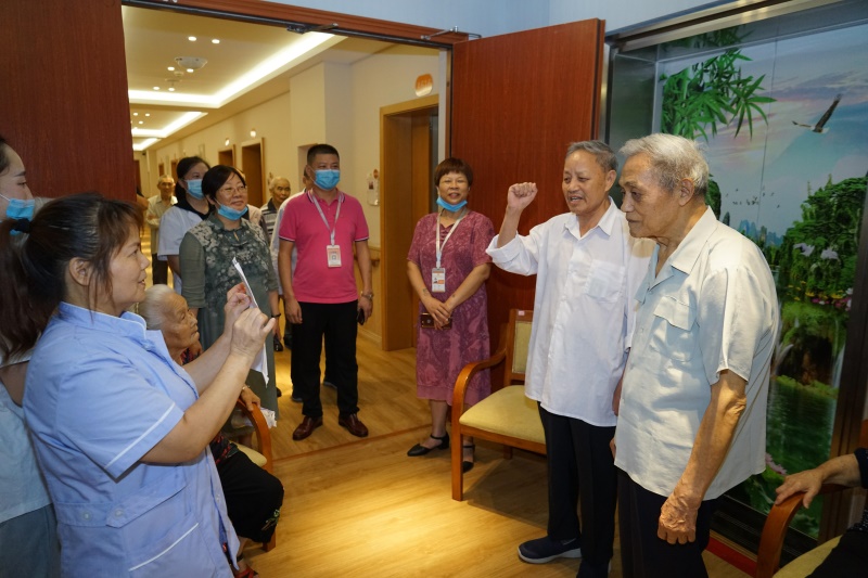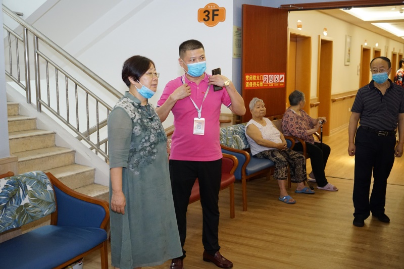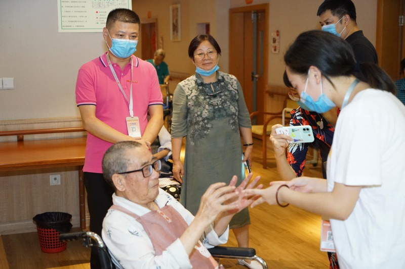 劉會長一行在服務大廳與陳總、羅院長等進行簡短交流后,參觀了位于服務大廳內的老人評估室,隨后進入院區(qū)進行參觀。劉會長與養(yǎng)護中心老人親切交流,積極互動,整個氛圍熱鬧且溫馨。