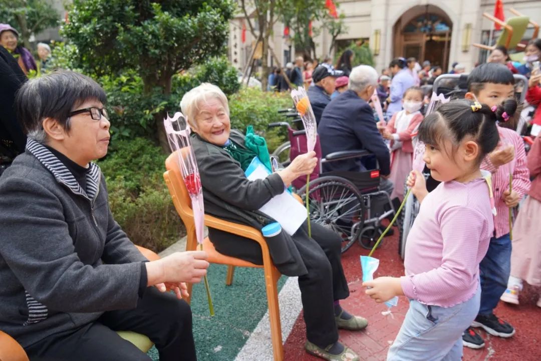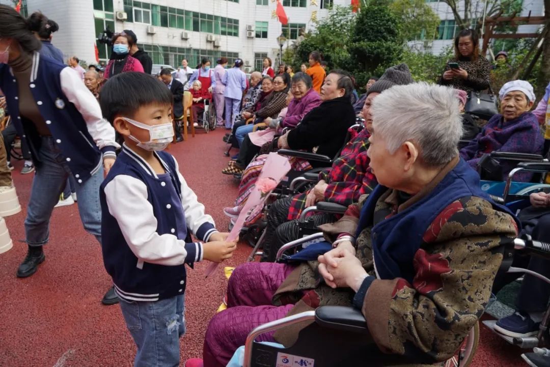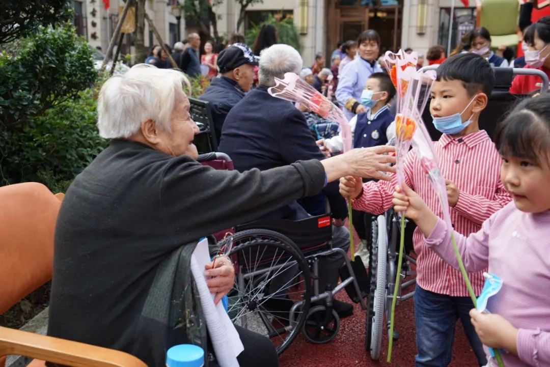 小朋友向老人獻花