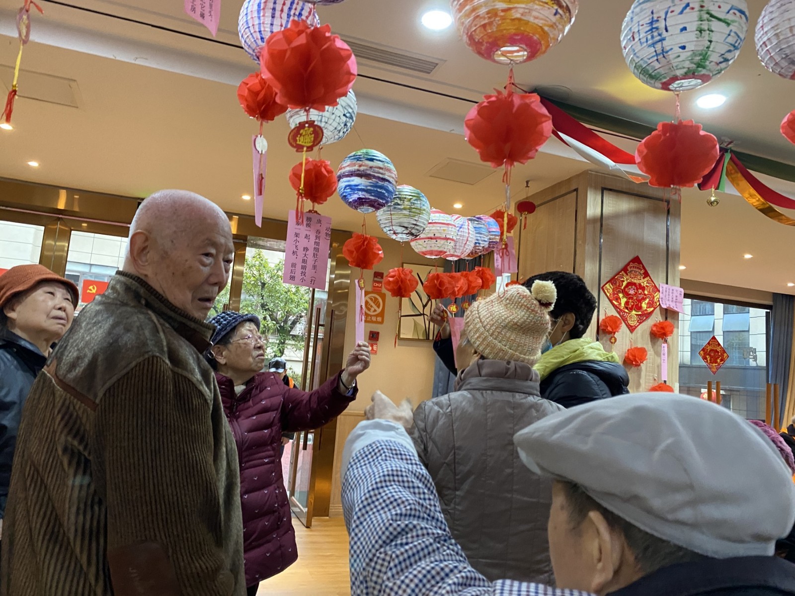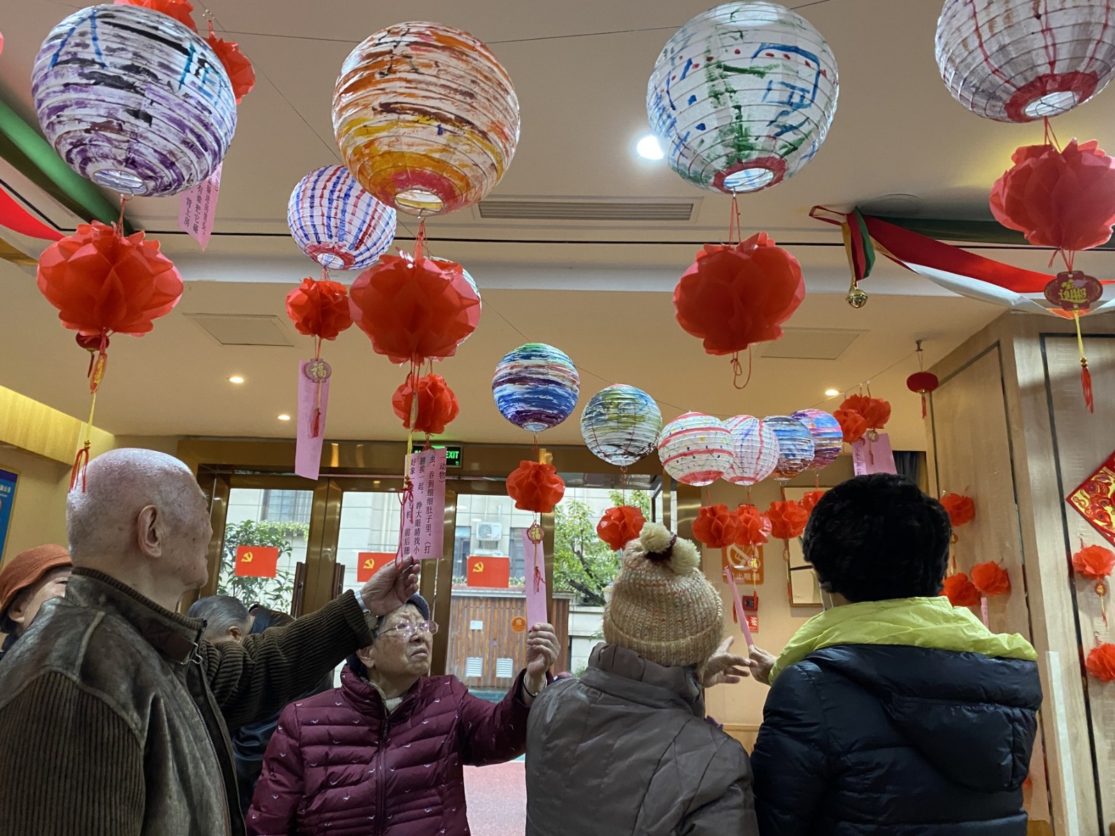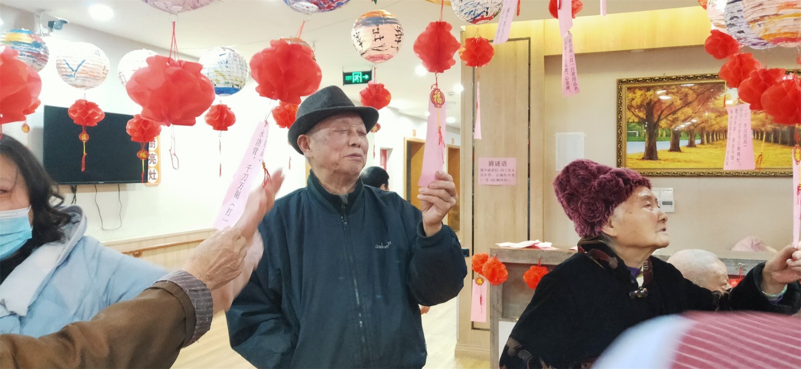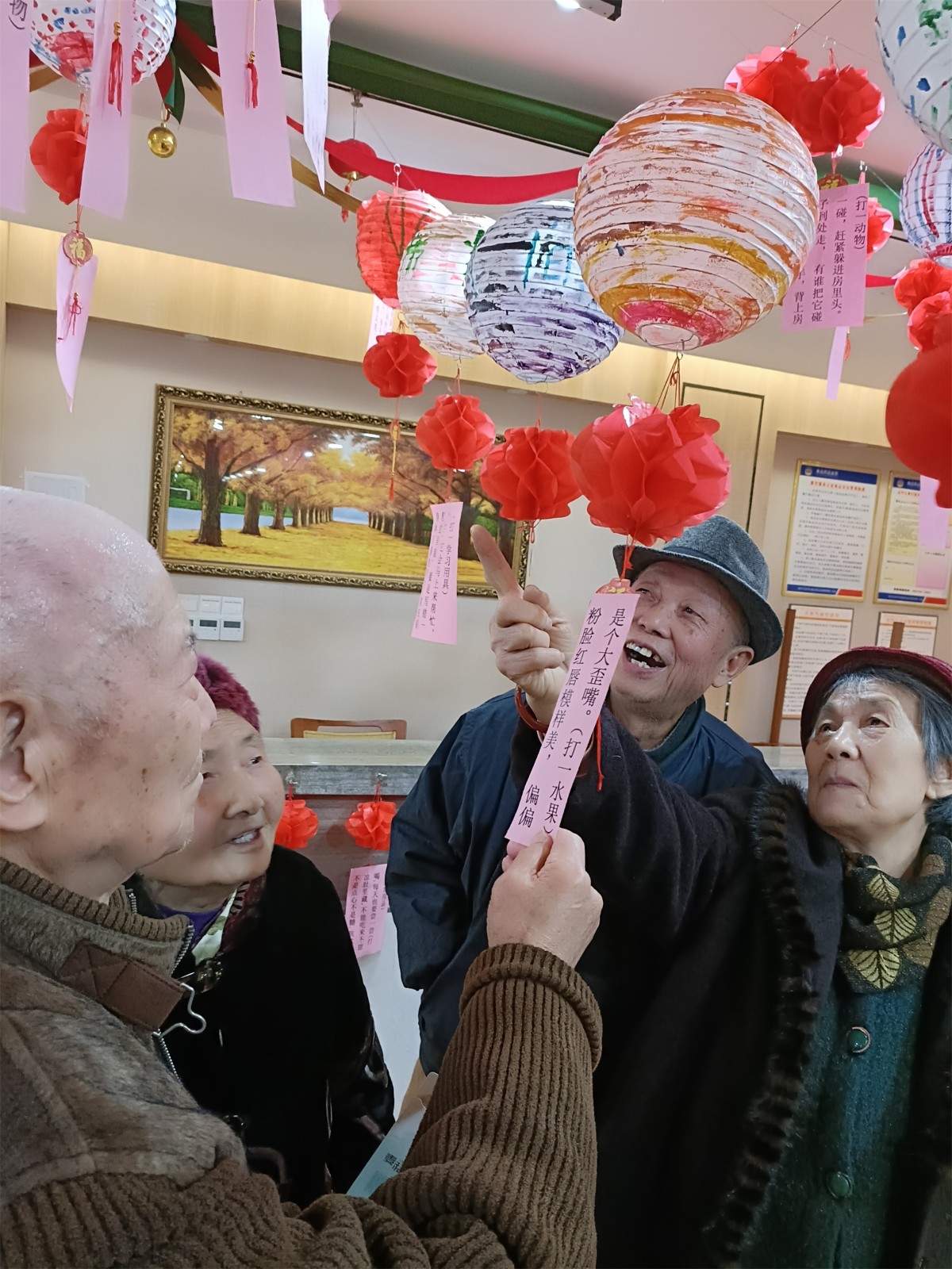 猜燈謎游戲中,工作人員將寫有謎題的字條掛在燈籠上。謎題涉及內(nèi)容豐富,有通俗易懂的趣味猜題,也有考驗(yàn)見識(shí)的傳統(tǒng)文化謎題,讓猜謎游戲既有娛樂性,又具知識(shí)性,充分調(diào)動(dòng)著老人的思維能動(dòng)性。