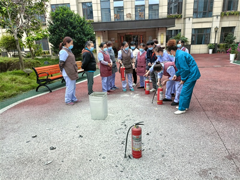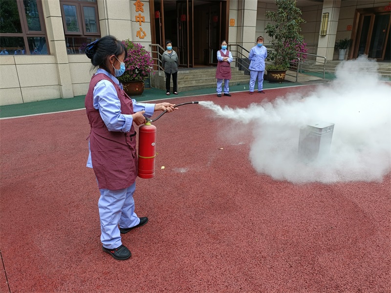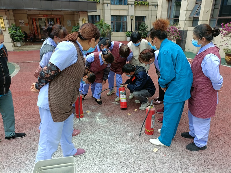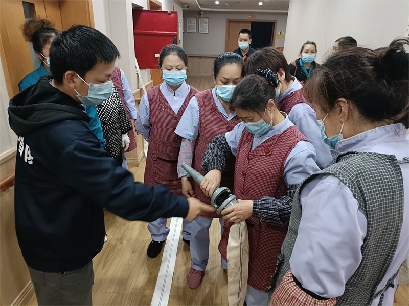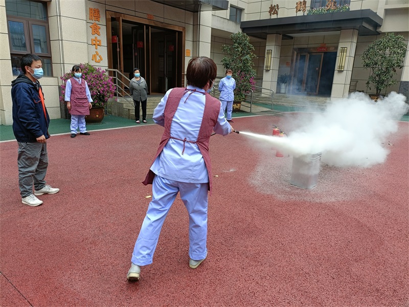 老師把滅火器的使用方法歸納為:一提、二拔、三瞄、四壓。待鶴鳴山老年養(yǎng)護(hù)中心的工作人員掌握了使用技巧,隨后在老師的示范下,一個一個親自上場演示了滅火器的使用方法。
