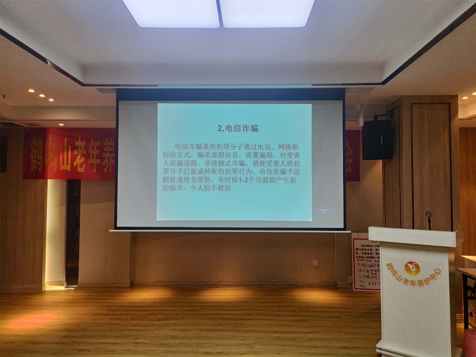 活動現(xiàn)場,高坪區(qū)公安分局江東派出所民警同志為老人講述了常見的詐騙種類、詐騙手段,近年來一些不法分子打著“服務(wù)老人“,“關(guān)愛老人”的旗號,卻行詐騙之實,將老人辛苦攢下的養(yǎng)老錢騙入自己的腰包,主要集中在保健品、積分兌換、中獎、電話欠費詐騙、冒充公檢法、冒充親朋好友等騙局,民警同志提醒大家要時刻保持警惕意識,不向陌生機構(gòu)和個人提供信息資料,不輕信,不轉(zhuǎn)賬,遇到可疑事件及時聯(lián)系養(yǎng)護中心工作人員。